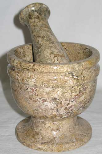 Lovely pedestal mortar & pestle crafted of coral marble. Each one unique. Allow for variations. Approx. 4" high; mortar opening 3" dia.