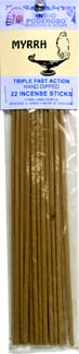 POWERFUL INDIAN INCENSE STICKS MYRRH Item #2000-603 22 Sticks per pack 11" Long, Triple Fast Action, Hand Dipped As one of the holy scents, myrrh incense sticks are used in purification ceremonies by those who wish to rid themselves of guilt so they can move forward. Also can be burned before going to bed to make all dreams come true.